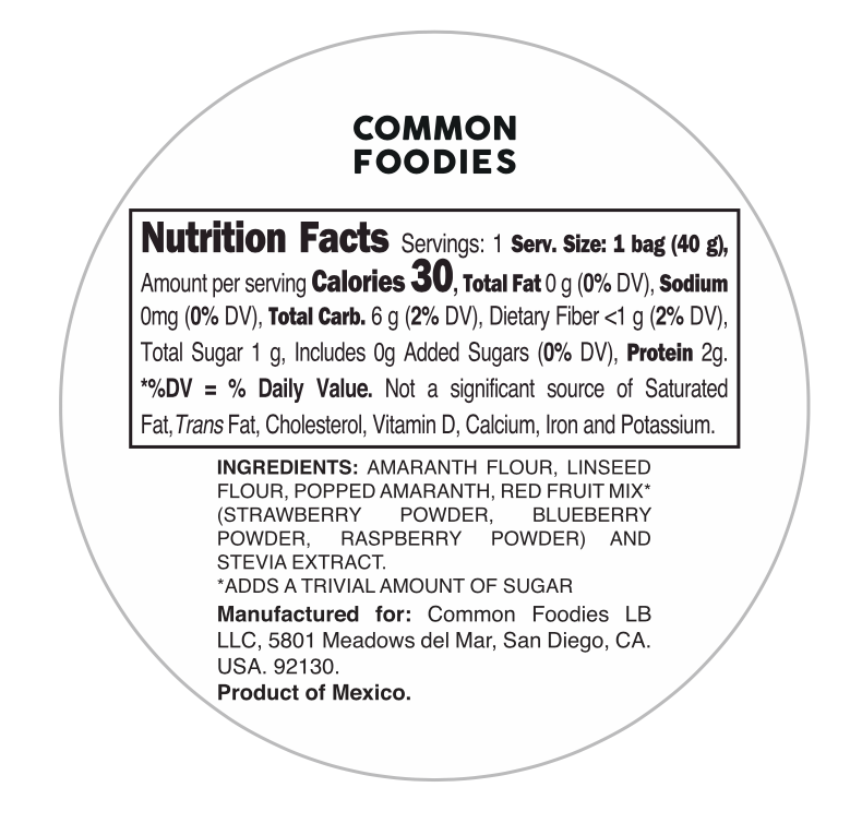 Crispy amaranth wafer made from organic amaranth flour popped amaranth and a mix of red berries. Sweetened with stevia. This guilt-free snack is so light and crunchy that it's easy to eat the whole pack without noticing.